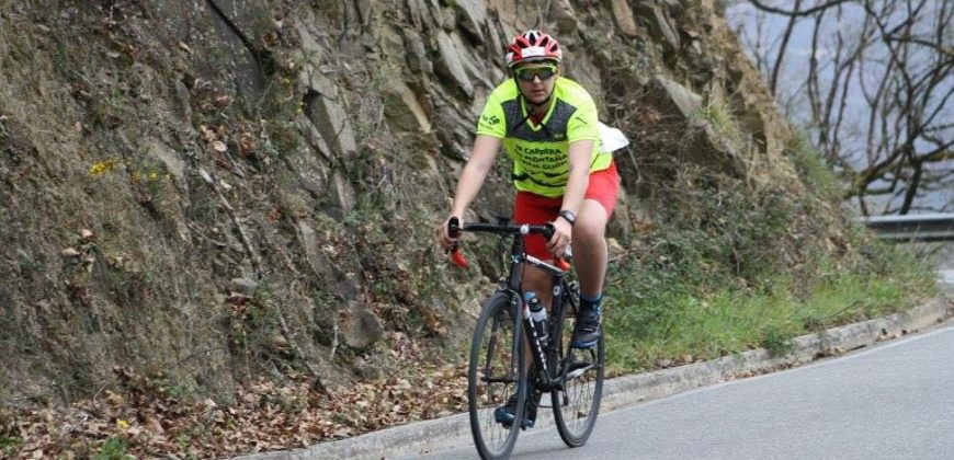 Comenzamos la subida de la vuelta 1, unos 1000 metros de subida, bastante dura para mi ya que siempre he rodado en llanos y pequeñas subidas, parecía interminable. Se me caen las gafas en medio de la subida (cosas de novato) , ya empiezo a ver el llano, ya llego arriba… Miro hacia la derecha y me encuentro una pared que no subía ni en coche, cojo el manillar y me pongo de pie en bici, 100 metros de subida más y otro llano. Llego fundido (primer trago de agua , no podía más), hago una curva a la derecha y otra pared, esta subida nunca termina, otra vez arriba de la bici y por fin llego arriba. Empieza la bajada tan deseada, ya empiezo a encontrarme a los primeros animadores en las cunetas (como se les agradece los ánimos). Toca descansar y disfrutar de la bajada, siempre con la mano en el freno, no sabia hacia donde tenia que girar, bajo bastante bien y recupero. Llego abajo y volvemos al inicio solo quedan otras 4 subidas…