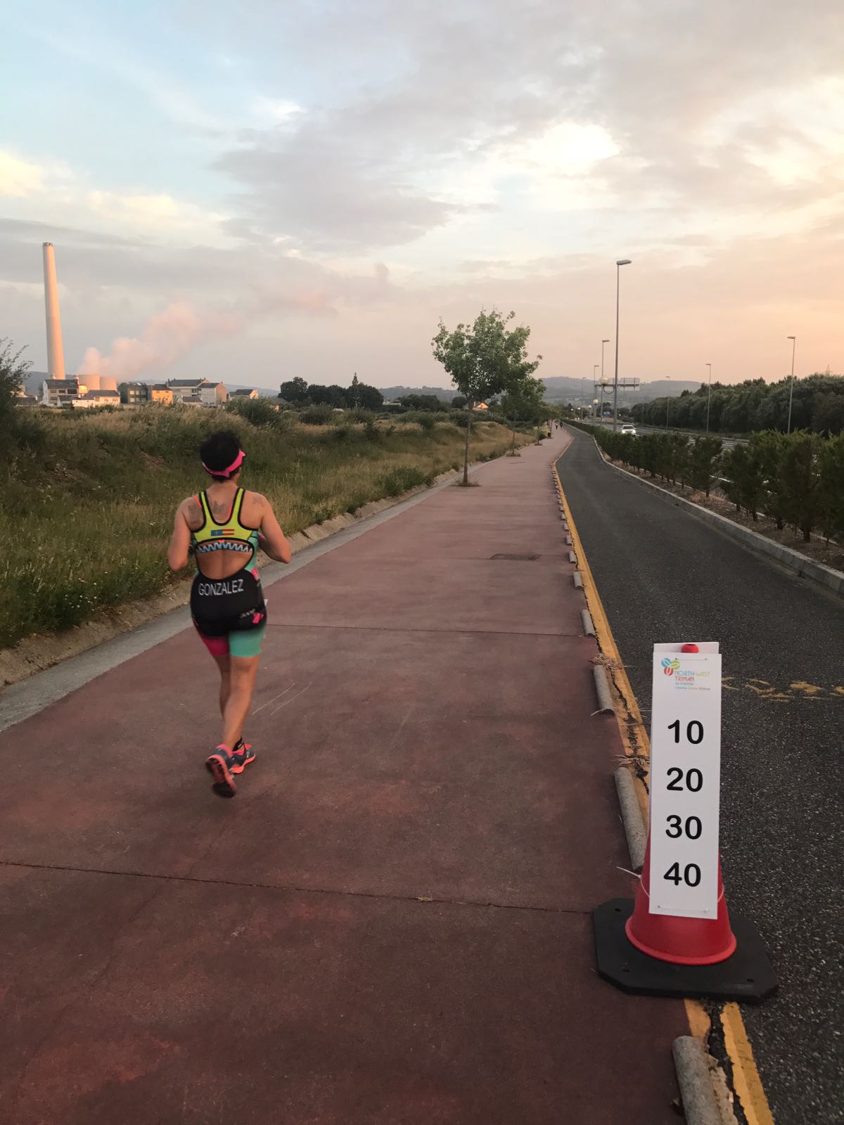 T2, mirando el reloj y viendo que todo iba como tenía pensado, sin prisa pero sin pausa. Nos volvemos a cambiar, otro paso por el WC y arrancamos a trotar, recibiendo otra buena inyección de ánimo, por parte de mi gente, que allí seguían, sufriendo conmigo. Una alegría inmensa me envuelve, porque algo me decía, que ya lo tenía más cerca, que podía conseguirlo. Subimos el enlace de transición y empezamos las 4 vueltas de 10km cada una. Me sentía bien, con fuerza, dos primeras vueltas muy buenas, rodeada de gente, ánimos por todos lados que te siguen cargando las pilas, ánimos de los que allí estaban presentes y de los que no, de todos mis compañeros del Team Sport Spirit, que en la distancia, me los hacían llegar. No podía sentirme más afortunada. Llega la tercera vuelta y sumado al cansancio acumulado, empieza un malestar y dolor en mis tripas, que no me deja casi correr. Hago un par de paradas para intentar vaciarlas, pero aún así, el dolor persiste, pero hay que seguir adelante, señores, esto es Ironman…Miro el reloj y ahora si que el tiempo se me echa encima, momento de bajón, físicamente hecha una mierda, mi mente tiene que hacer los últimos km. Y así fue, paso a paso, mirando adelante y dirección a meta. Yo sufría y los que me esperaban sufrían conmigo.